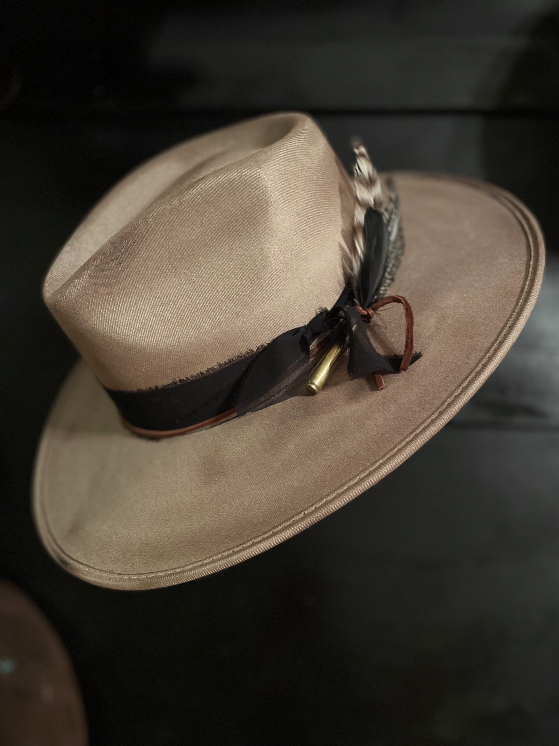 WIDE BRIM PINCH TOP FEDORACUSTOM SILK BAND WITH FEATHER AND SPENT BRASSBURNED, TORCHED, AND DISTRESSED THIS IS A POLY BLEND AND IS DESIGNED, AND BLOCKED TO HOLD ITS SHPAE.