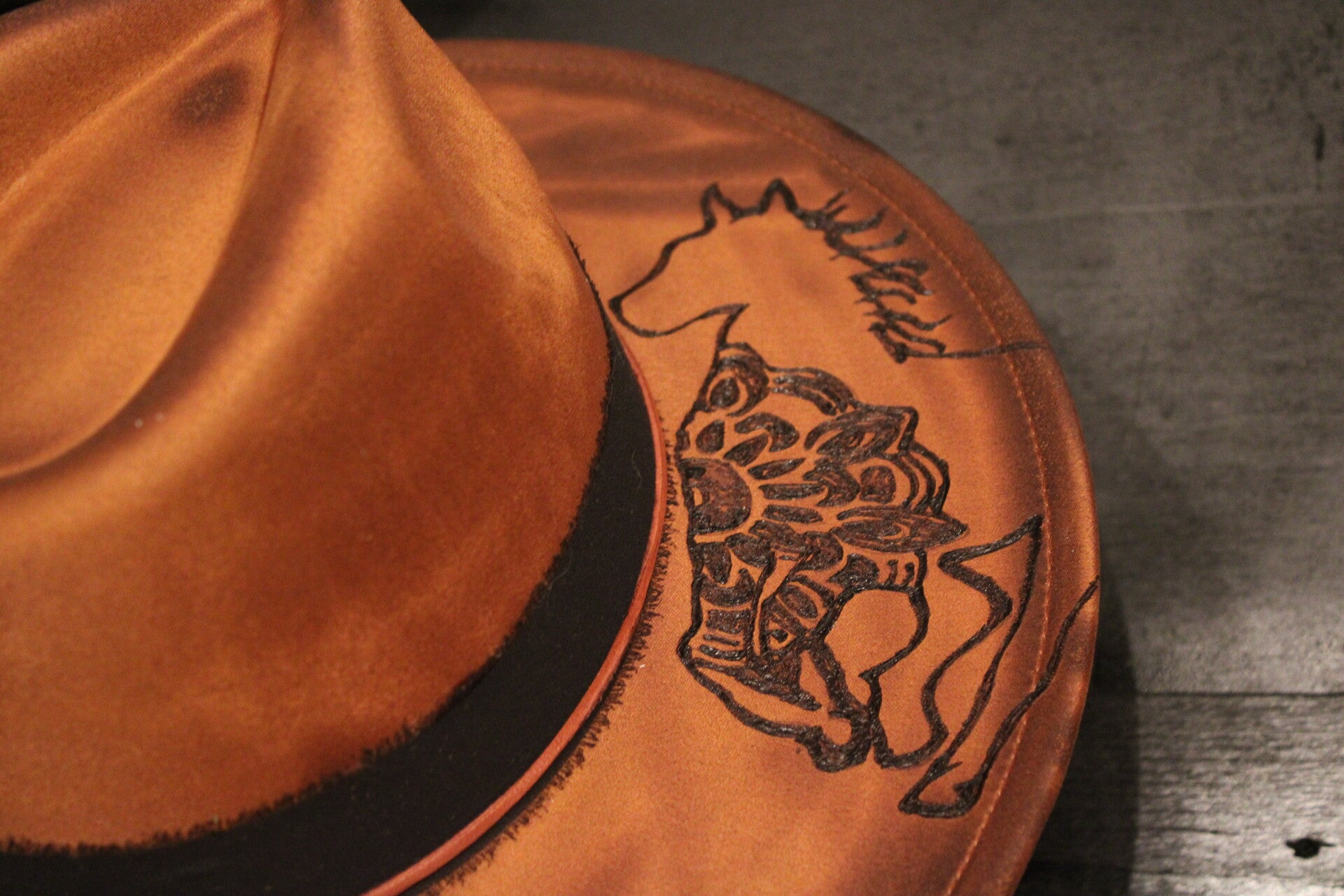 CUSTOM HAND BURNED WIDE BRIM FEDORATORCHED EDGESGENUINE CUSTOM LEATHER CORD/SILK BAND