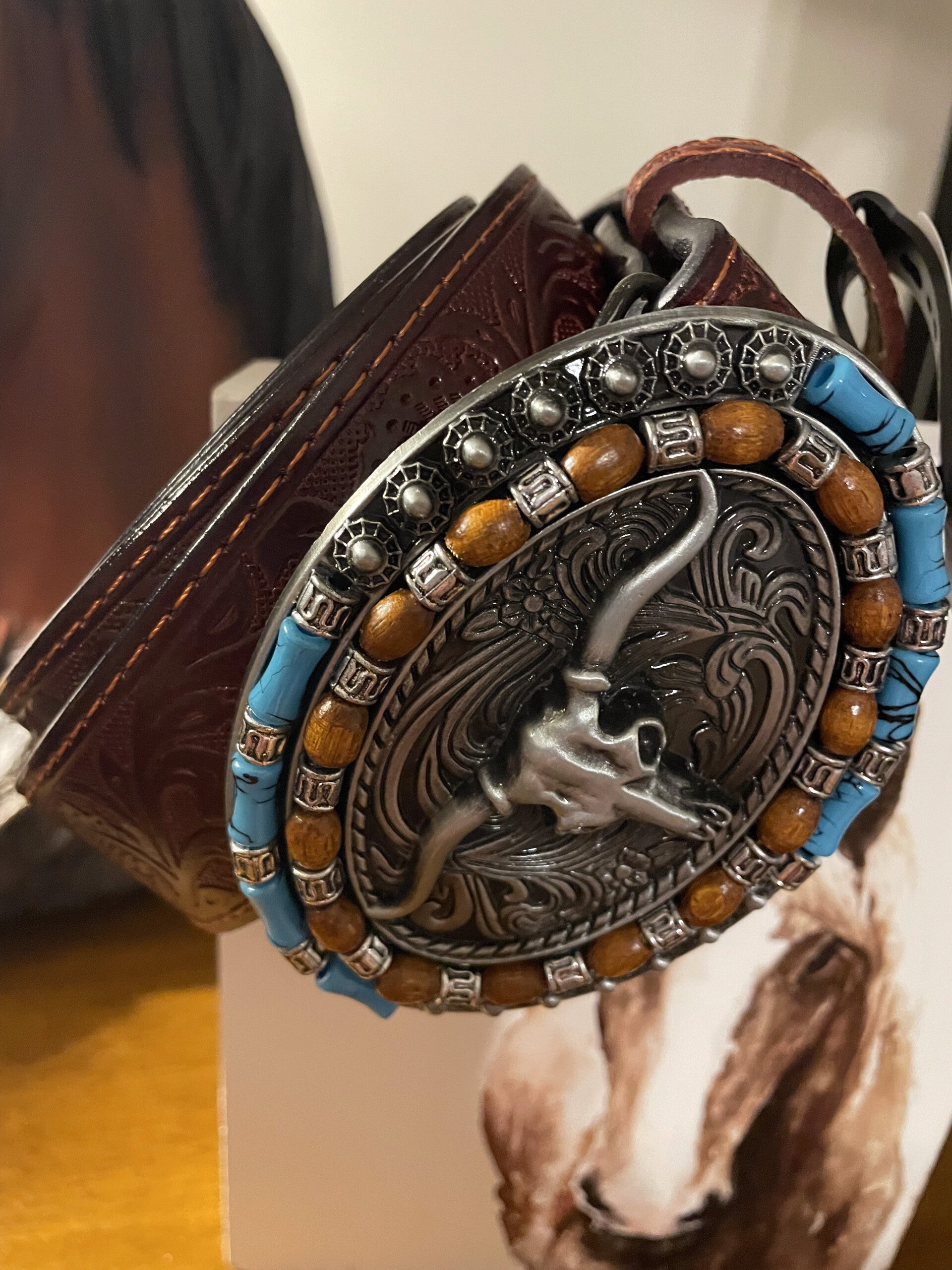 STEER SKULL BUCKLE WITH WOODEN BEADS AND TURQUOISE